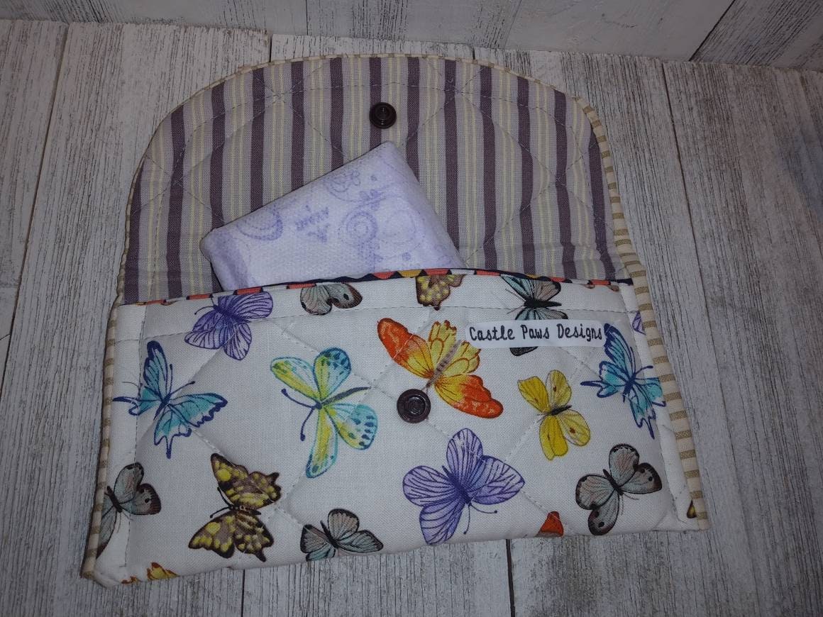 Quilted foam Fabric clutch with plastic snap closure. Use as a purse for photos, credit cards, make- up, sanitary supplies, eye glasses, etc.