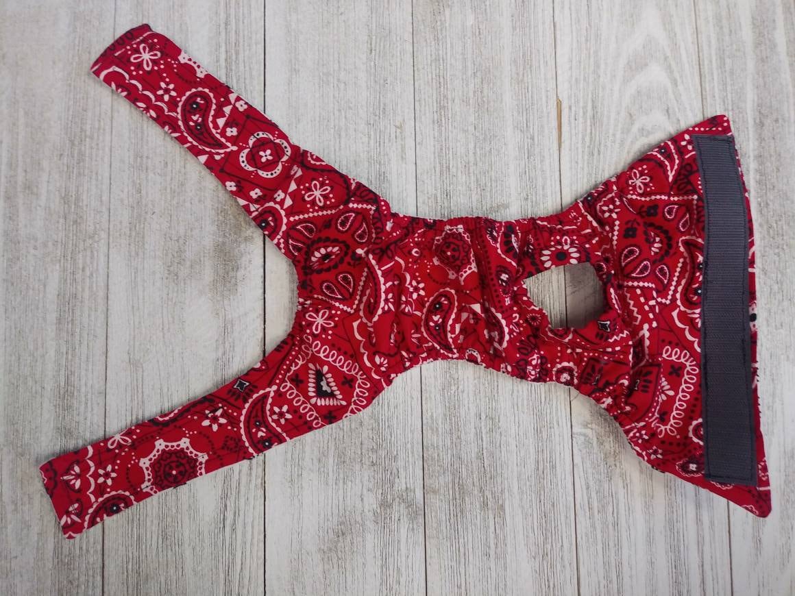 My diaper garments are made from 100% cotton fabrics, lined with soft flannel. Elastic around the legs and back of the garment for a comfortable fit. NO TAIL OPENING style option is available for tail less breeds or "bob tails" and those that need stools collected.