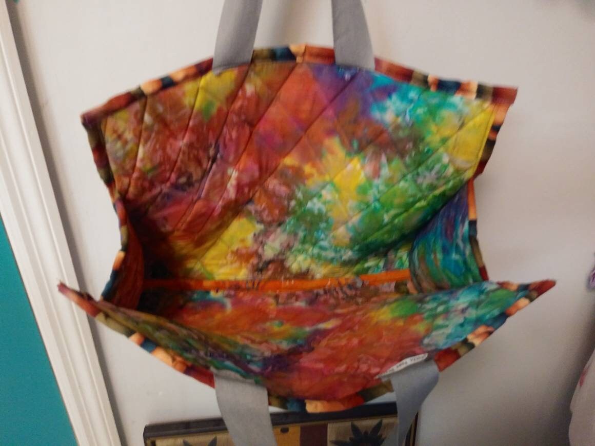 Large market tote beach bag, diaper Bag or use as an overnight bag etc. Nice gift too. Colorful patchwork fabrics quilted. Nylon handles/straps. From non smoking home. Handmade in USA. 17 X 14 X 5