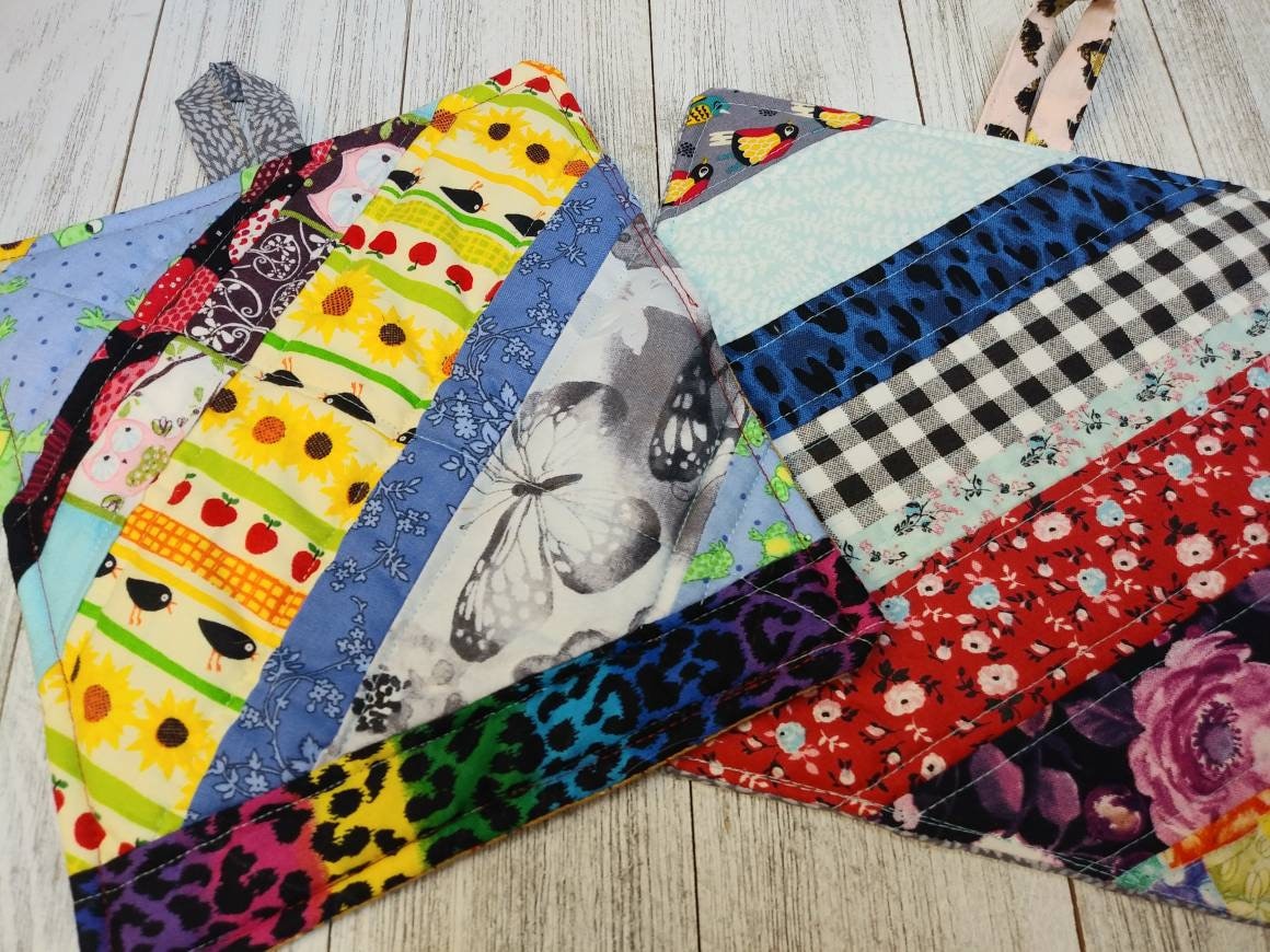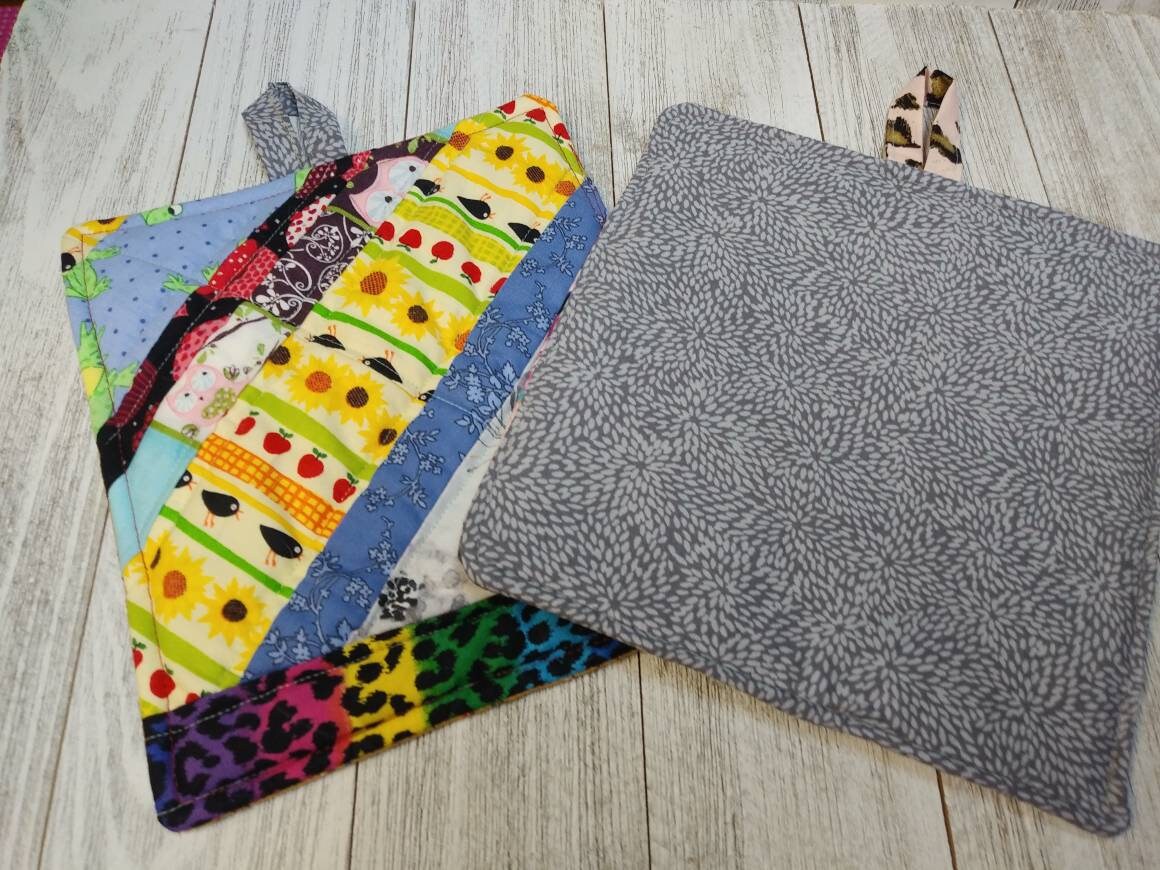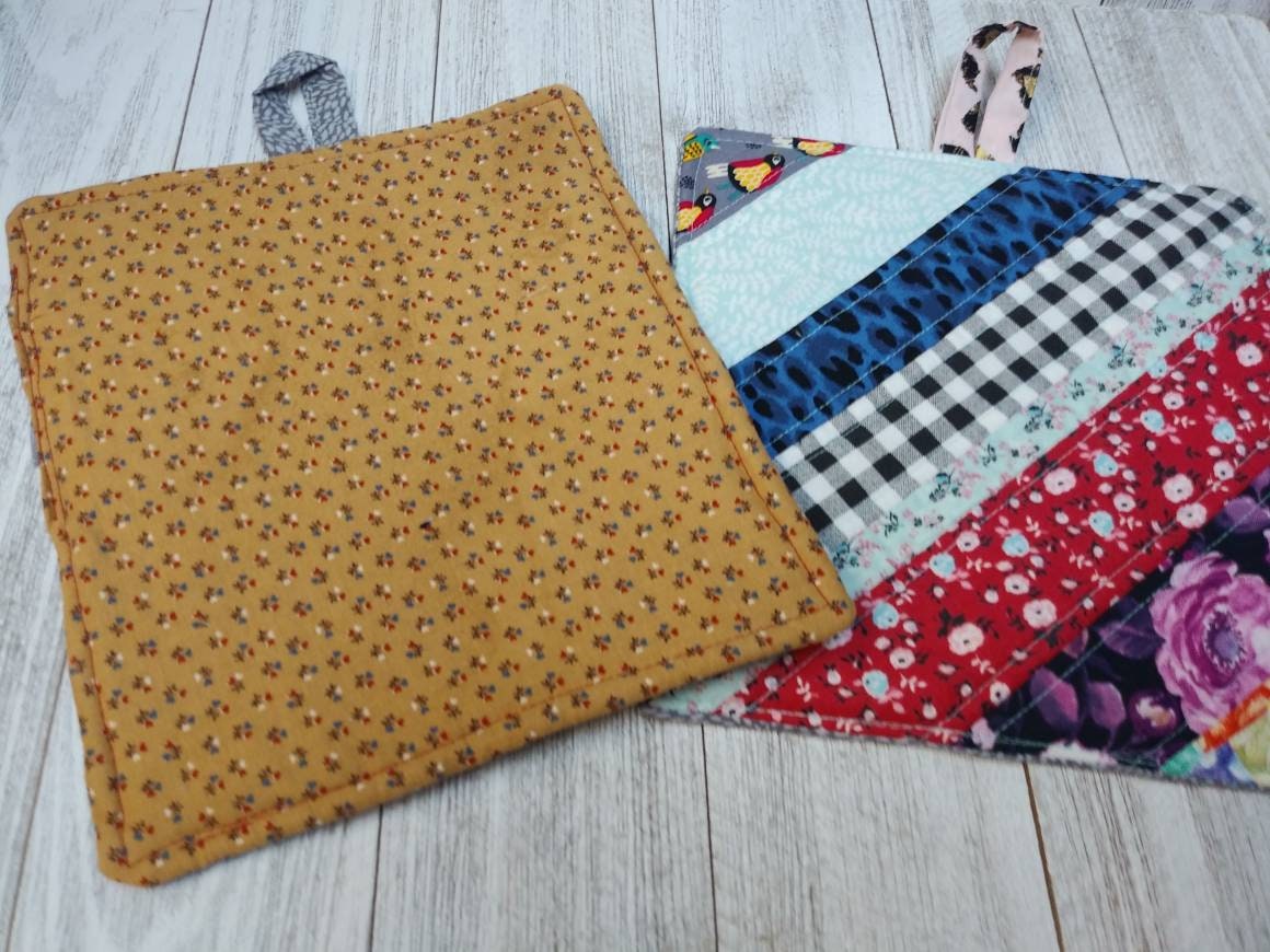 This listing is for a set of two Beautiful cotton quilted FABRIC Pot Holders or Hot Pads. Fabric handles for hanging. PATCHWORK pattern. No two identical. ONE of a kind. Back side is different fabric print as shown in Photo. Size is approximately 8 X 8.5".