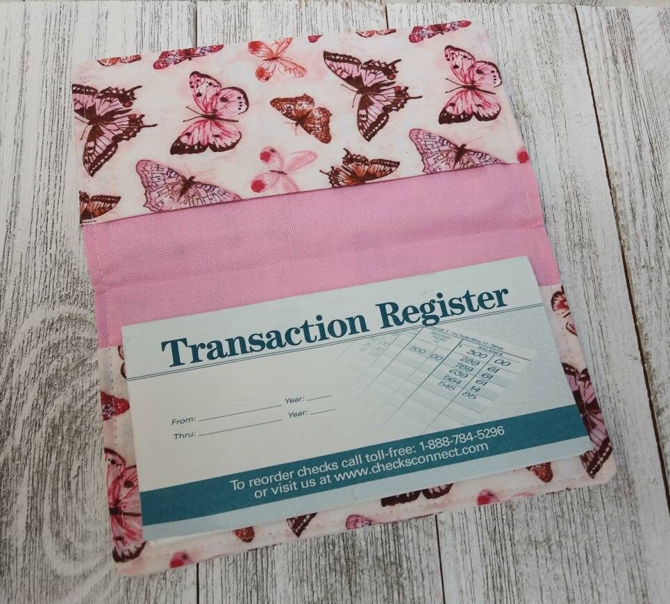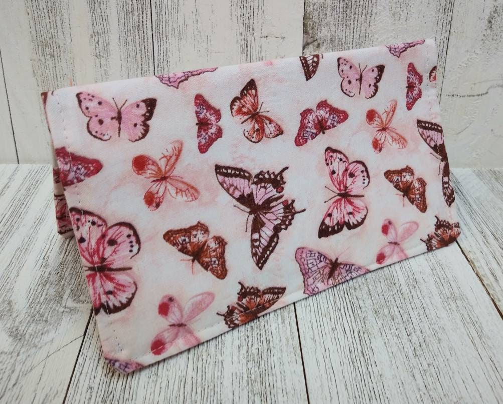 Pink BUTTERFLIES Check BOOK Cover Transaction Registry Cotton Fabric Document Coupon Transaction Organizer Purse Accessory