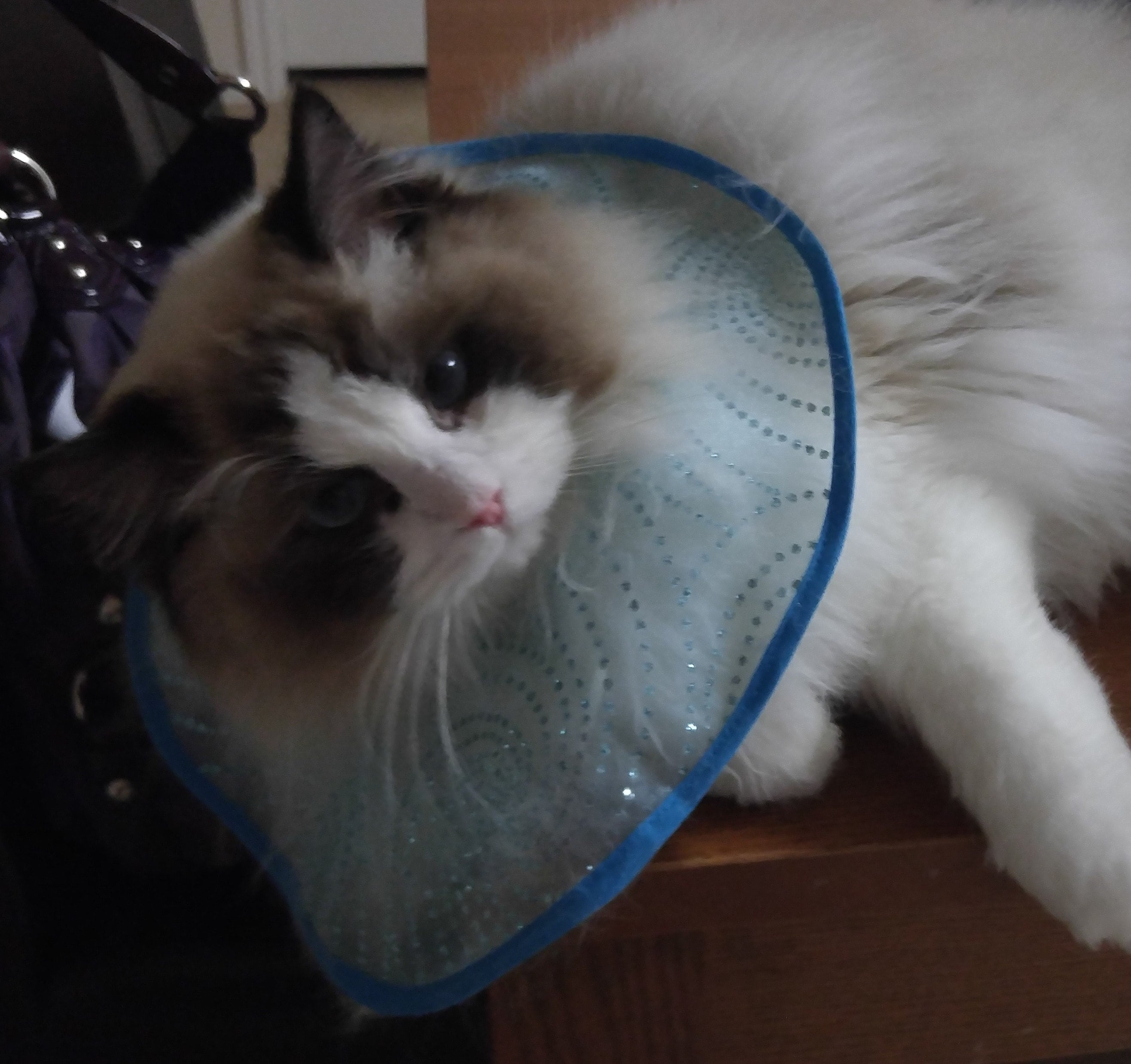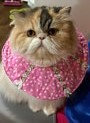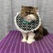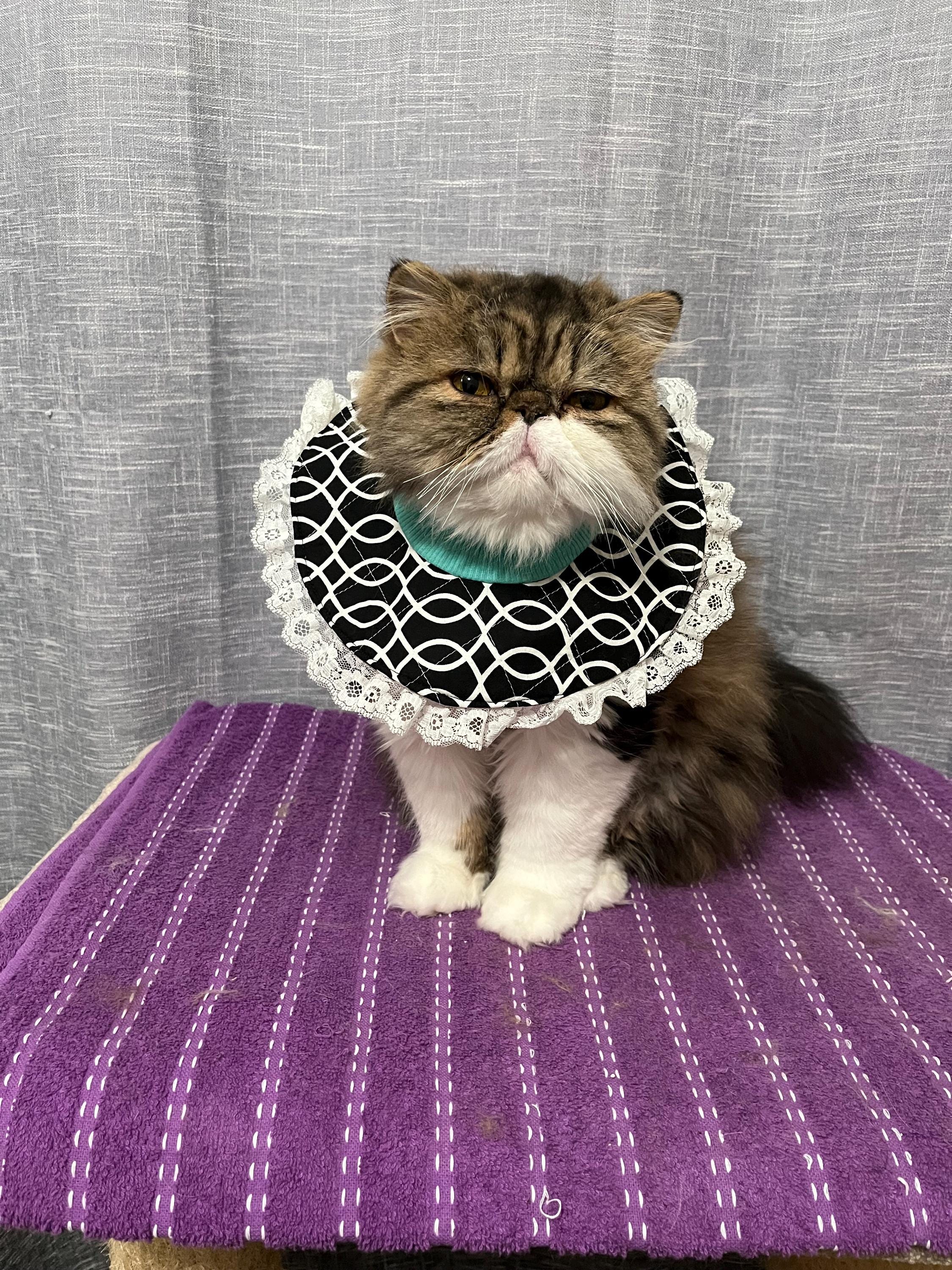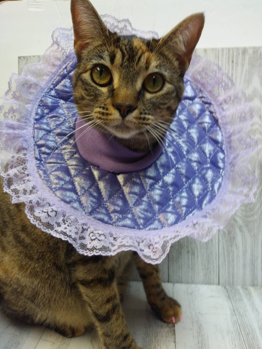 easily slips over your kitties head. The collar usually isn't exposed much on long hairs due to the ruff covering it. No raw edges. Machine serged. Machine sewn in USA.