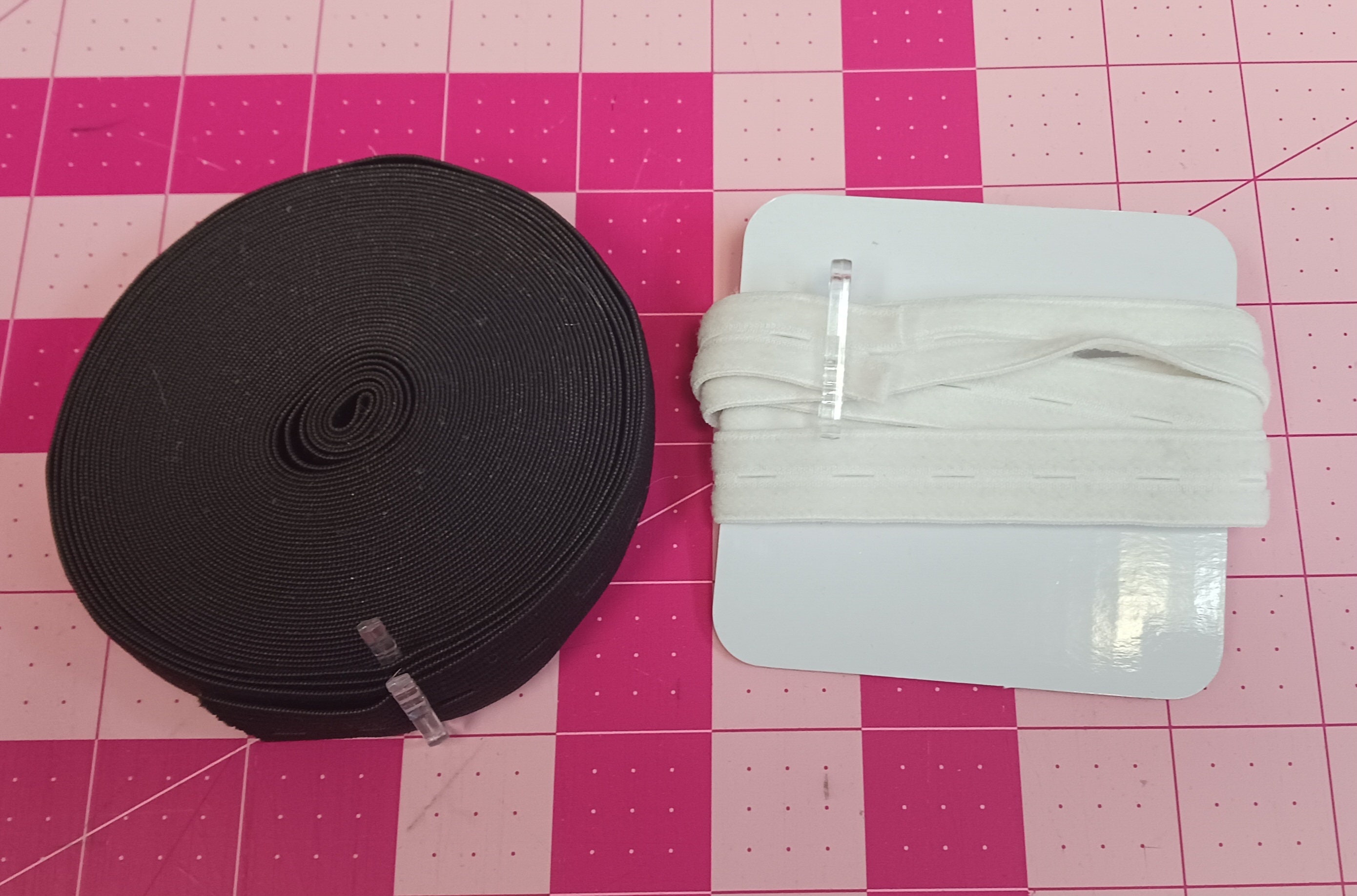 One yard of white buttonhole elastic and much more of the black buttonhole elastic.