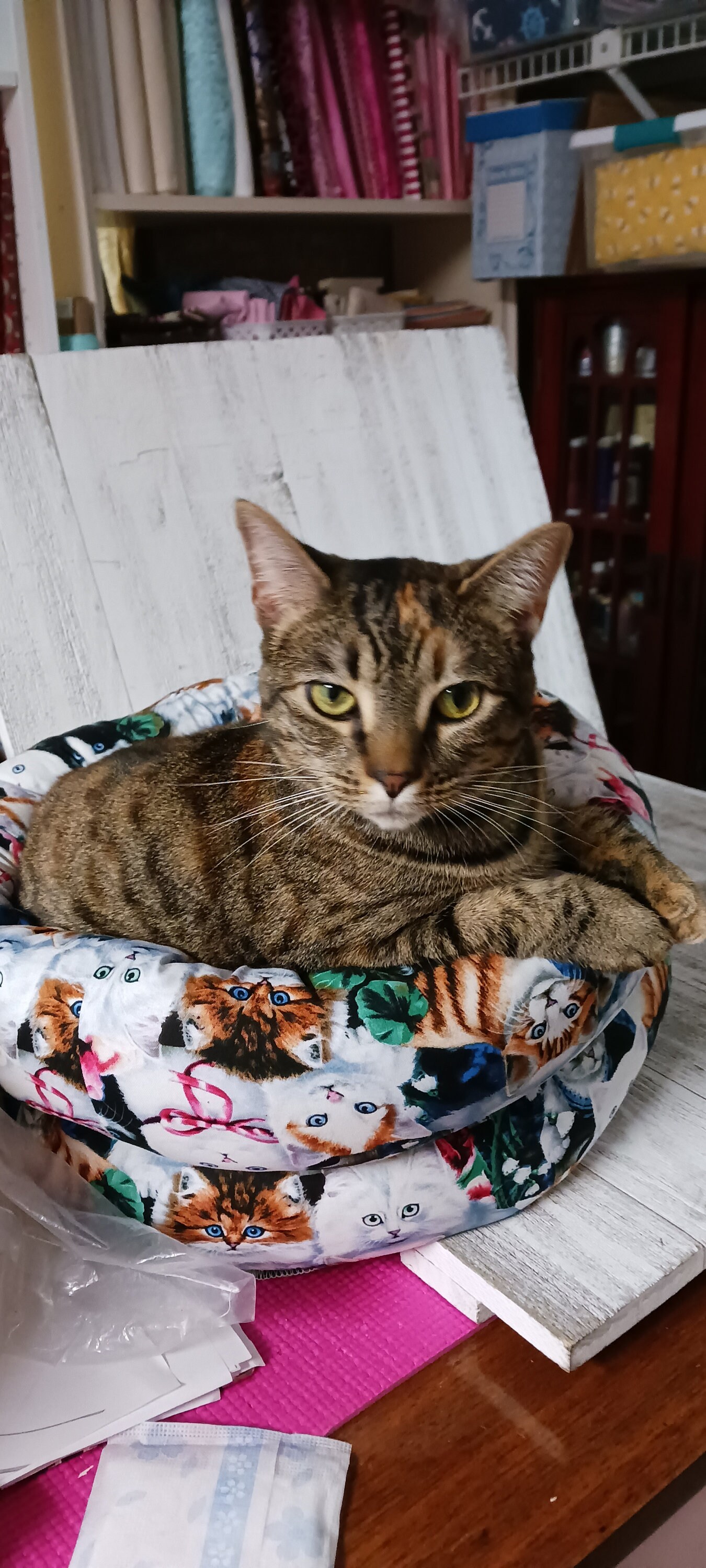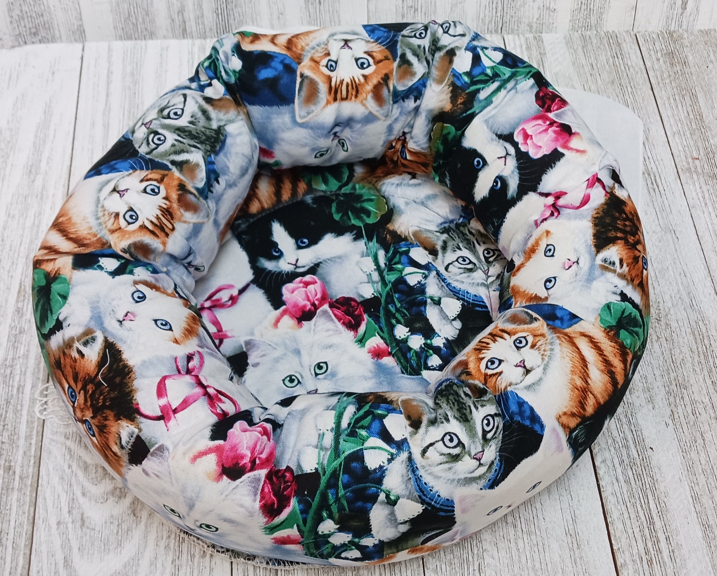 this listing is for one kitten size donut bed with soft polyester stuffed sides and 1/4" foam bottom. Made of 100 % cotton fabric with soft comfy poly stuffing. SEWN and stored from non smoking home. readymade and handmade in USA. Round bed 16 inches across from side to side. Adult size is 18 to 20 inches across.