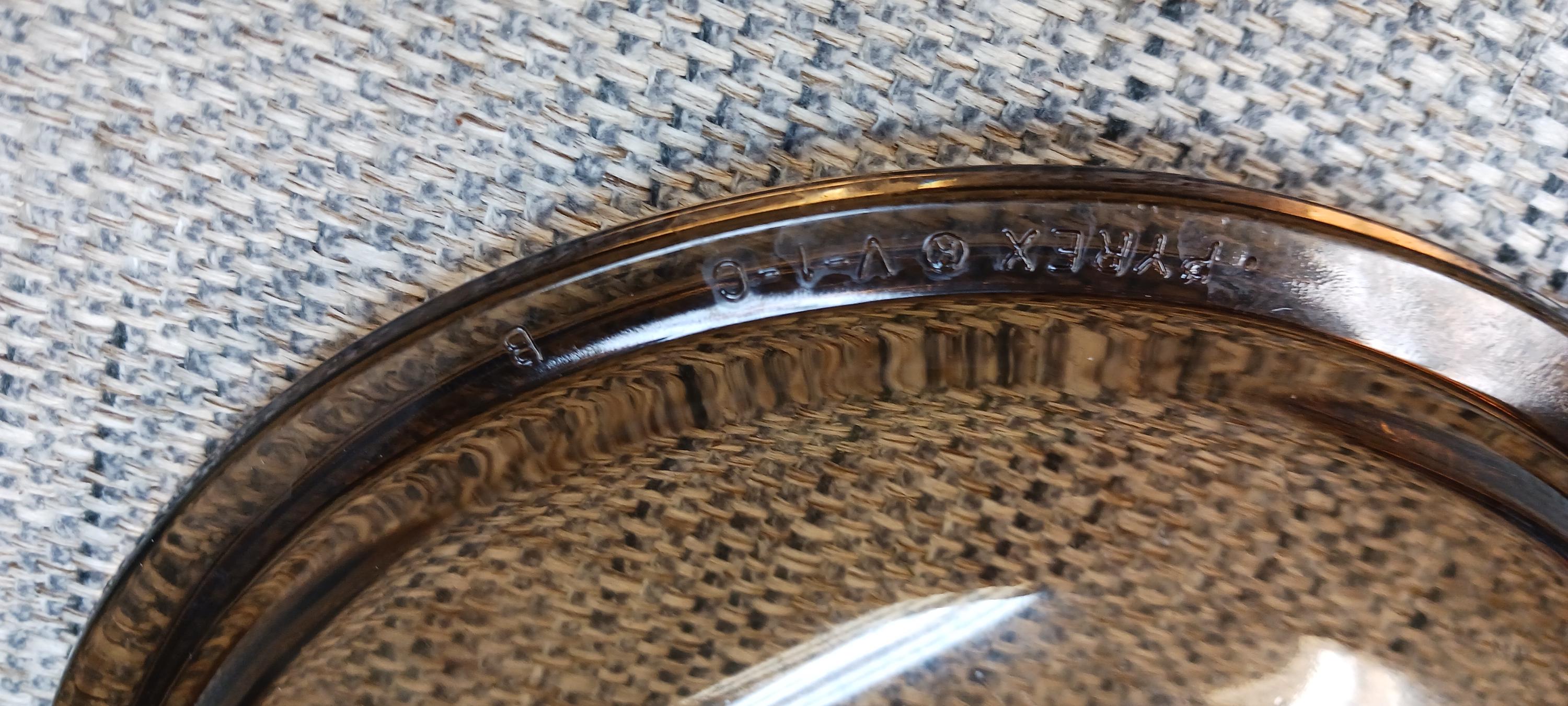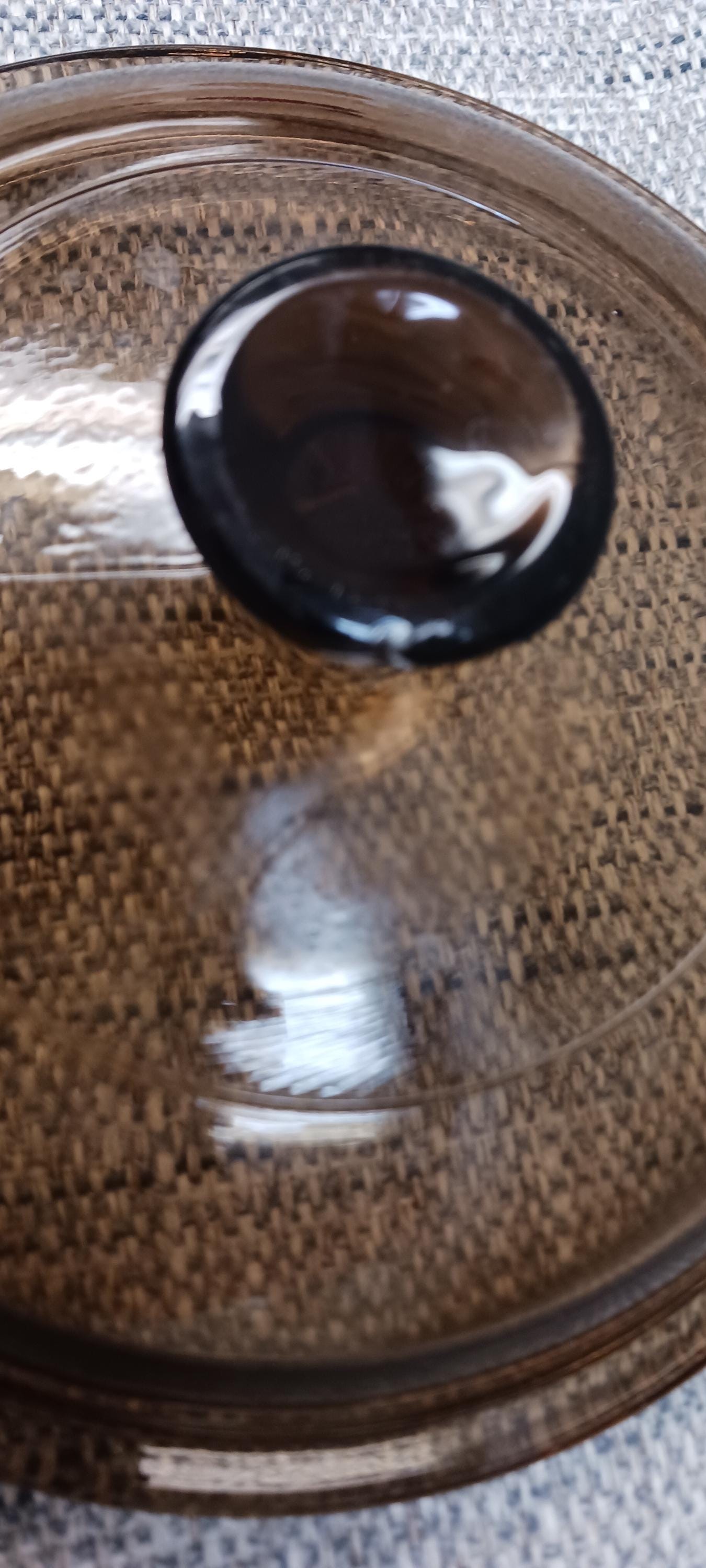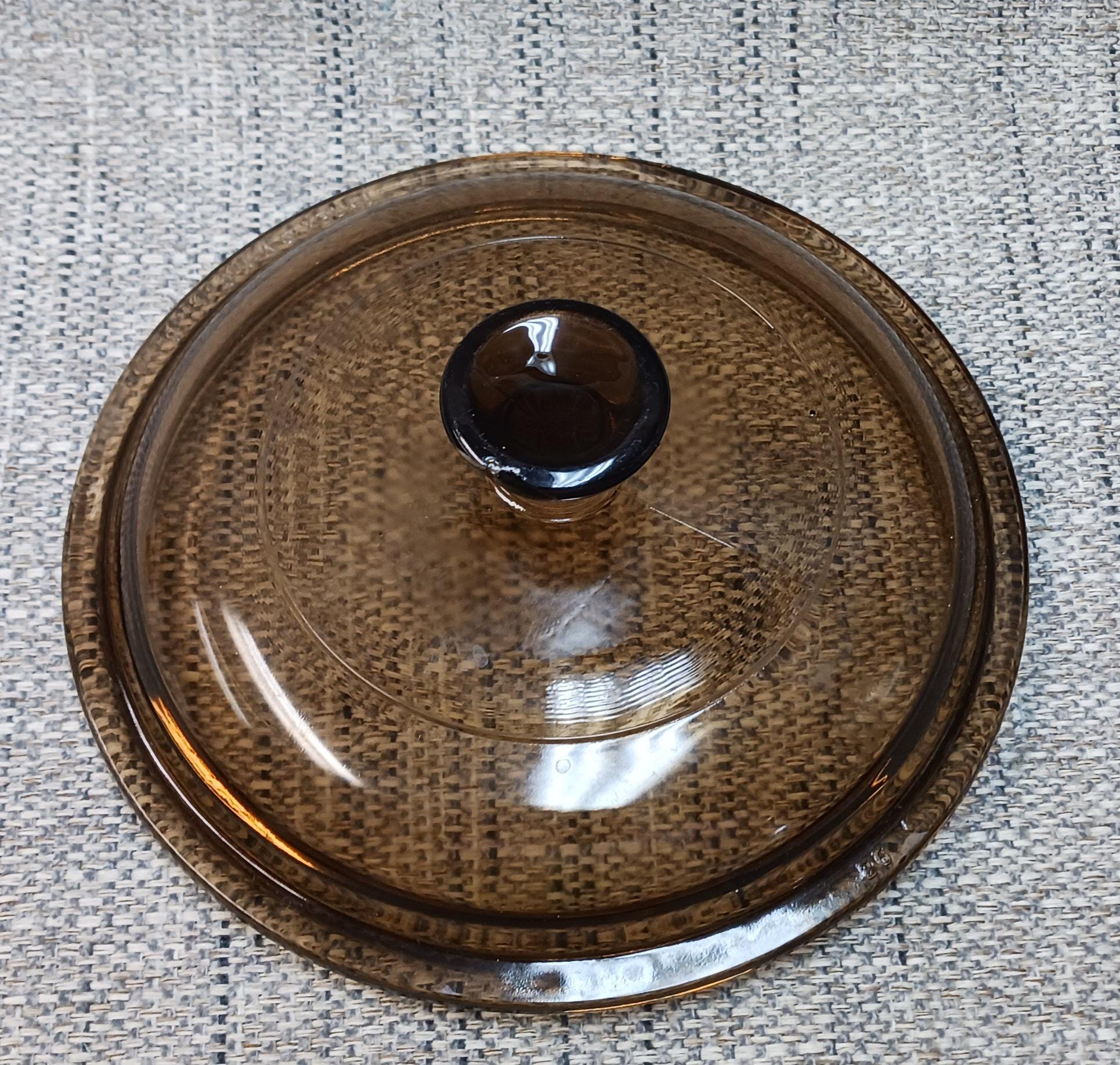Vintage PYREX lid about 6.5 inch amber Glass Lid with grab handle. Made in USA. V1CB.