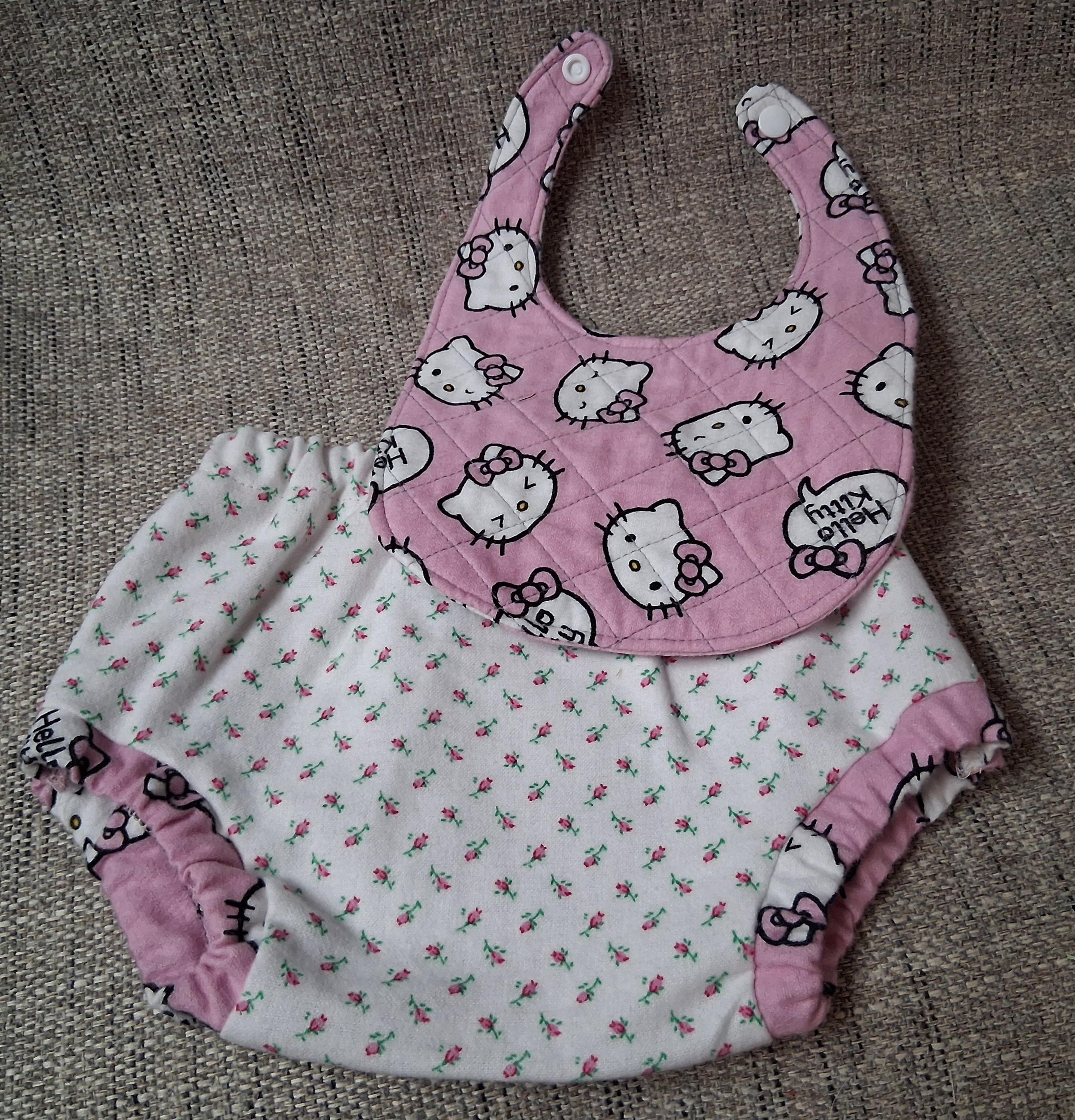 Newborn infant Baby size Diaper Cover and Quilted bib with snaps. Lovely gift or treat your own. Cotton flannel fabrics. 100% natural.