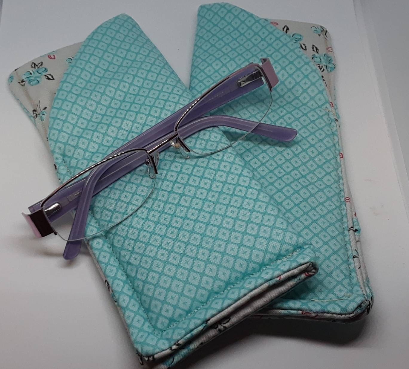 Quilted padded eye glass wear case for safe coverage and storage. Gentle machine wash or air dry.