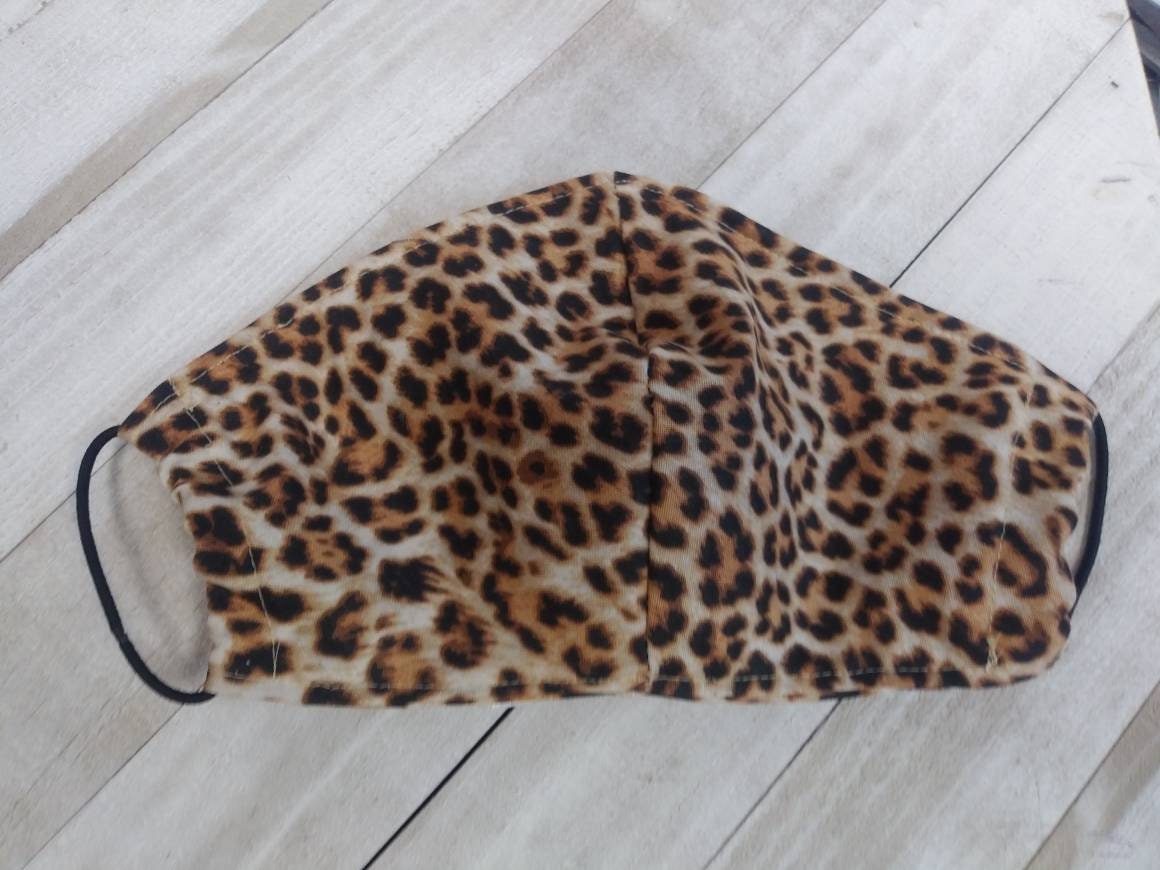This listing is for one handmade SIZE SMALL LEOPARD fabric face mask covering with elastic straps and inside pouch pocket for HEPA Liner. fabric 100% cotton . Elastic can be changed out with shoe strings, ribbons, fabric strips etc. NO NOSE WIRE sewn inside.