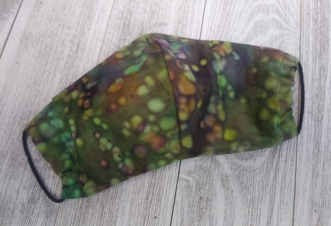 This listing is for one handmade SIZE SMALL GREEN Batik fabric face mask covering with elastic straps and inside pouch pocket for HEPA Liner. fabric 100% cotton. BATIK IS A HEAVIER, CLOSER WEAVE FABRIC providing more protection and highly recommended for masks.
