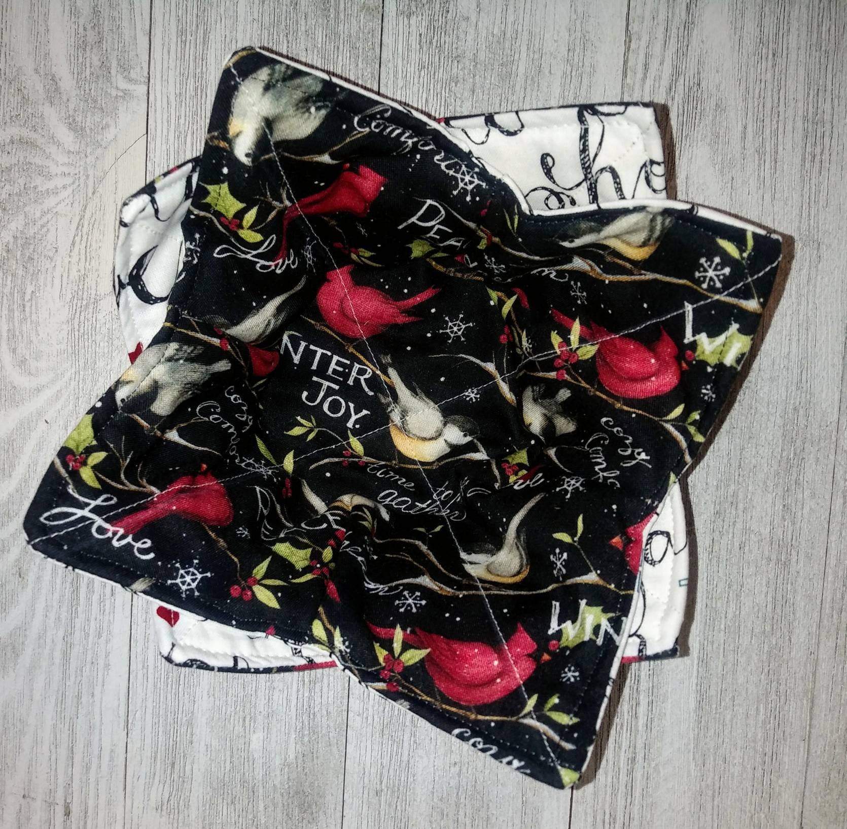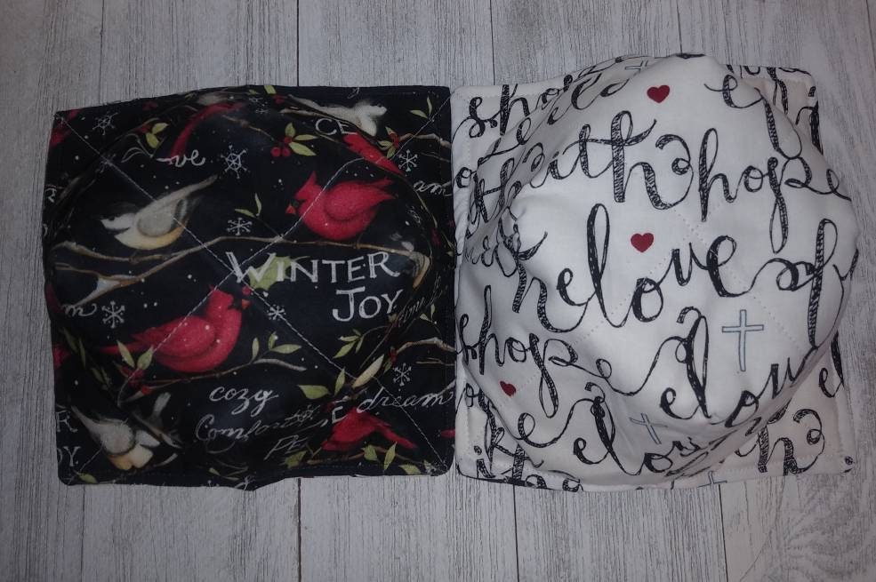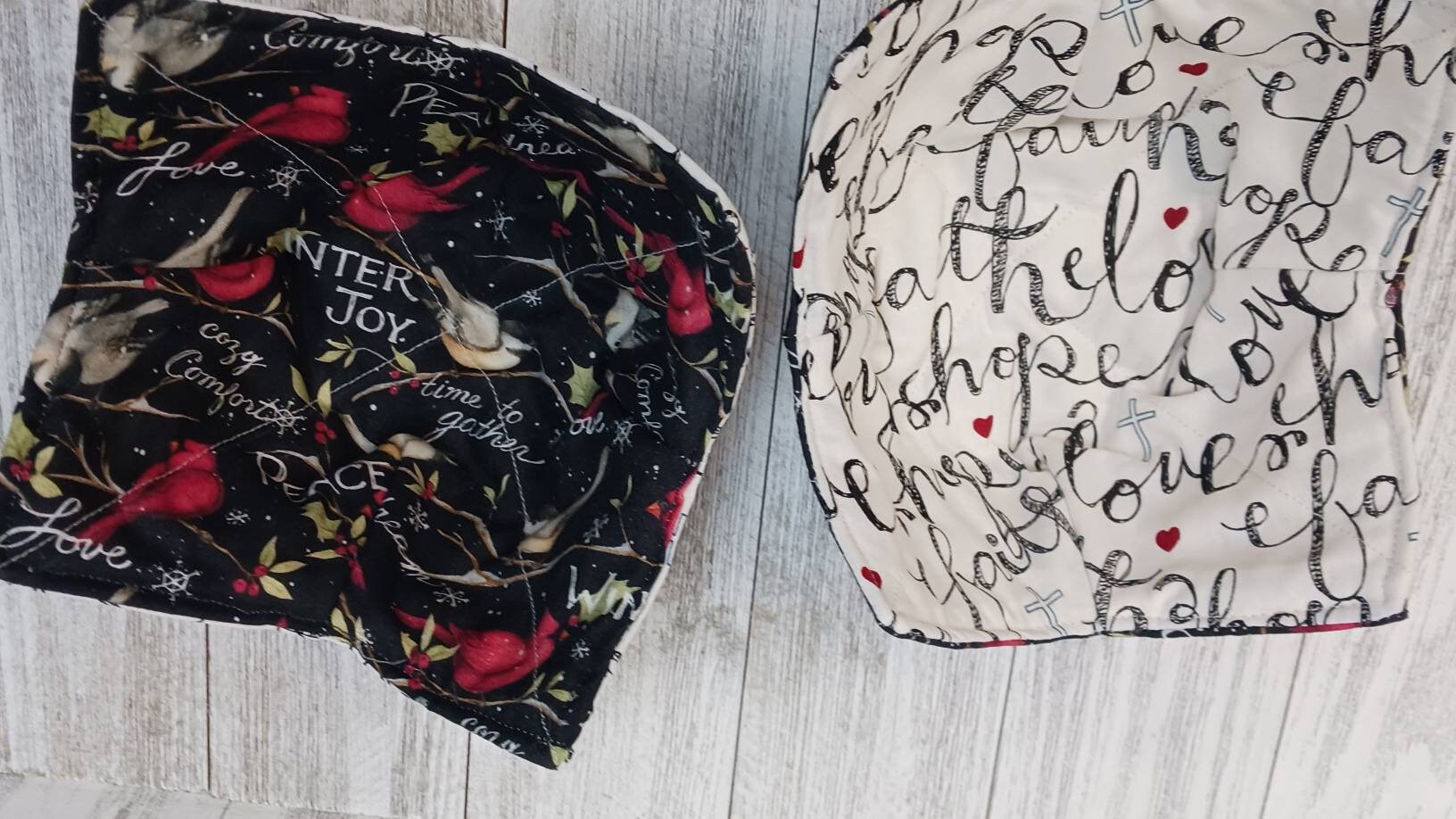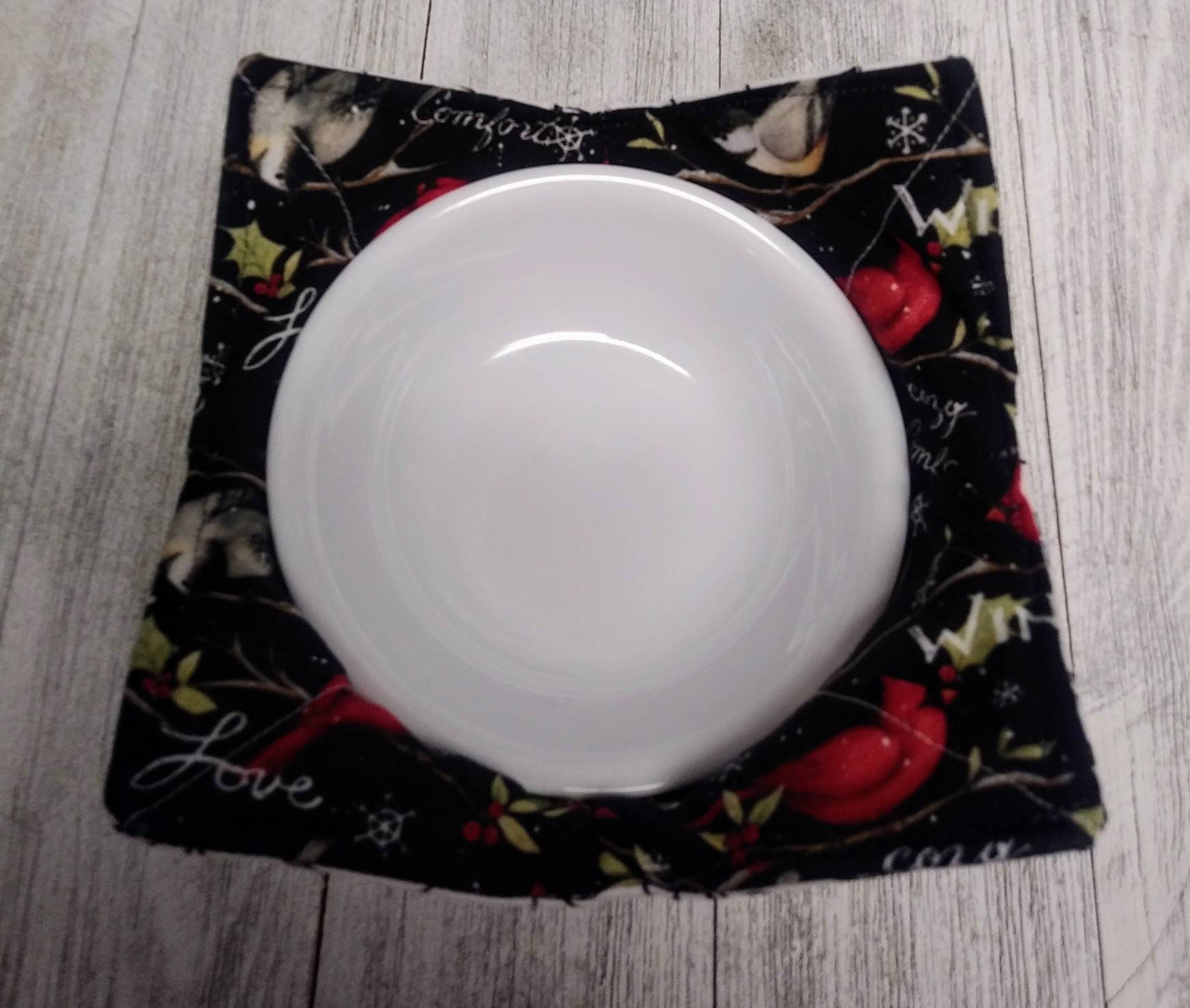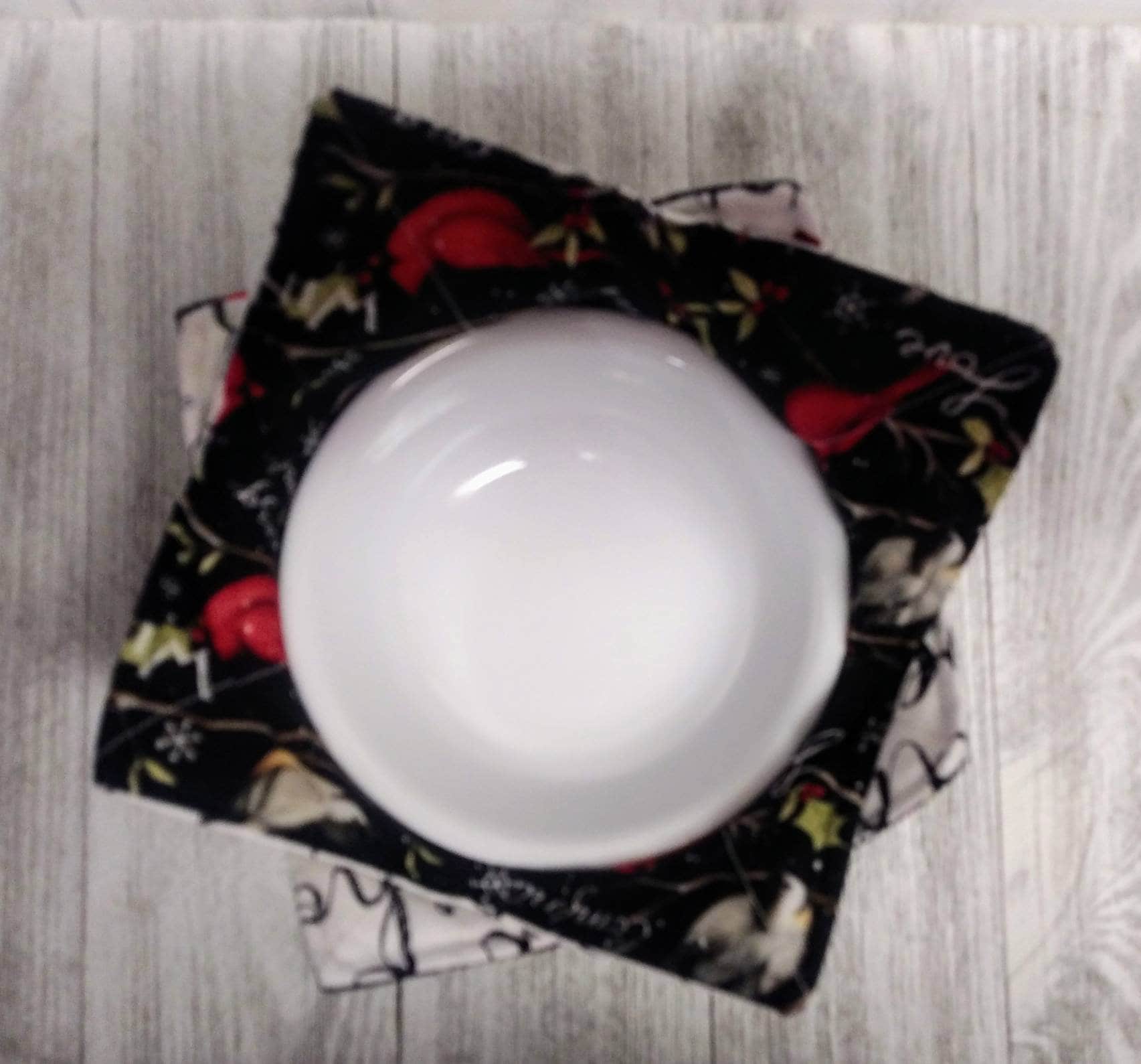 Quilted Fabric microwave bowl koozies for use in the microwave, lined with 100% cotton fleece inside. Size Small fits 10 inch round or square bowls. No more fingers burned! Heat up your hot grits, oatmeal, soups, frozen dinner, etc. without burning your fingers. Use the handles for holding the fabric dish. Great for cold ice cream as well. Make great gifts for all accasions! Wedding showers, graduations, hostess gift, Valentines. Handmade by me in the USA. Buy as sets or many as you need for family and friends!
