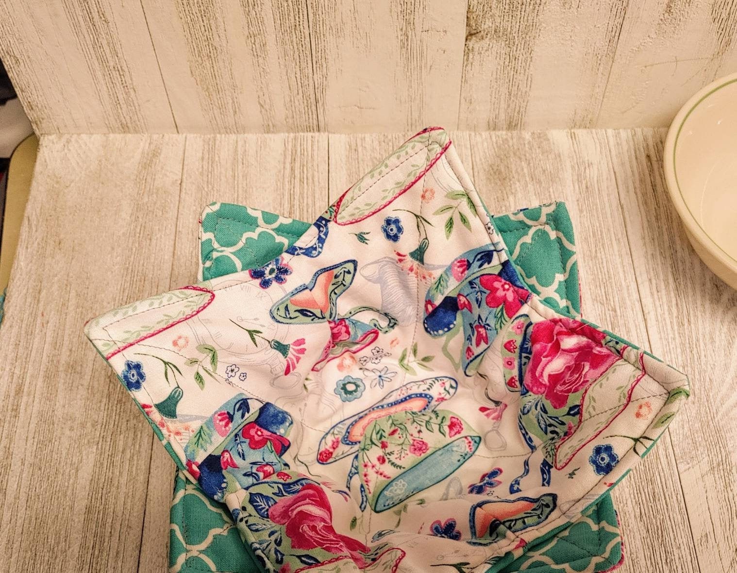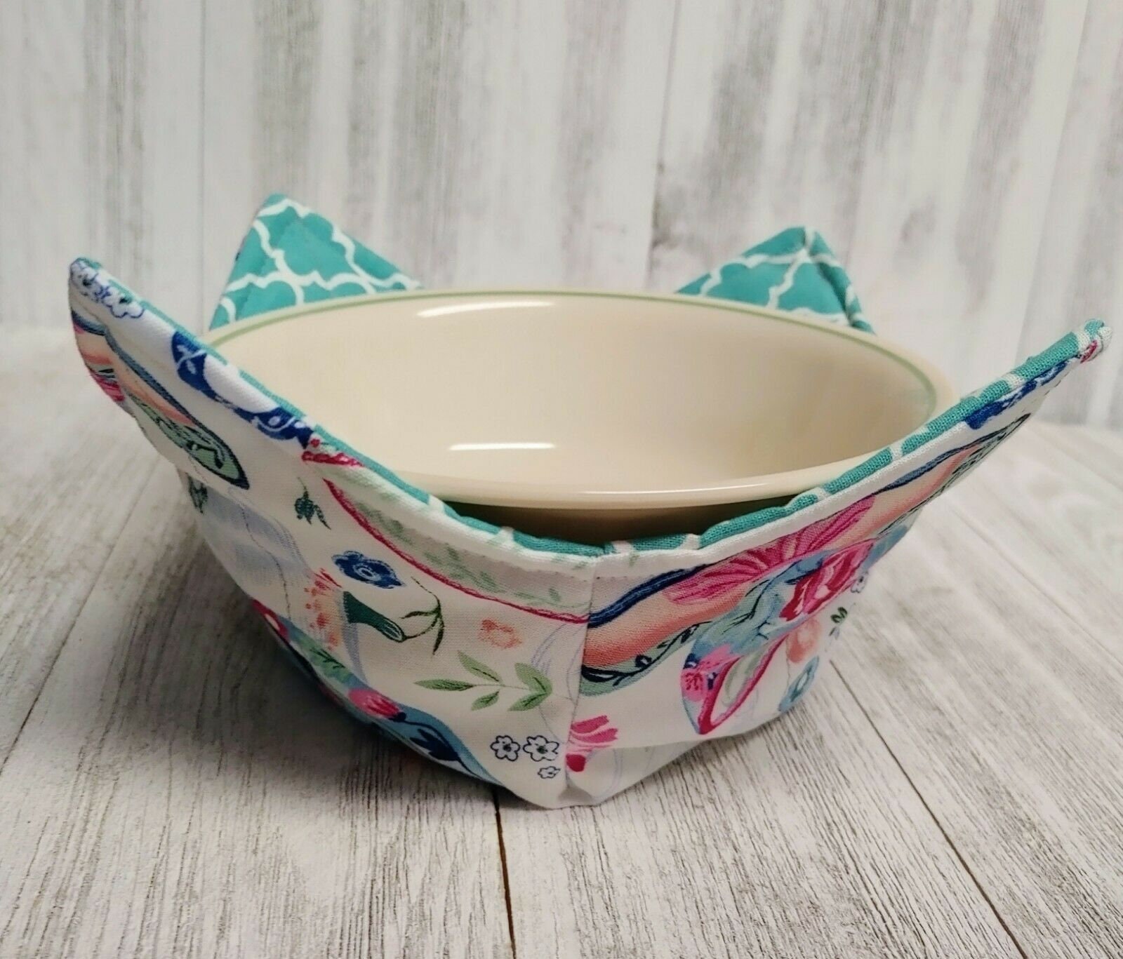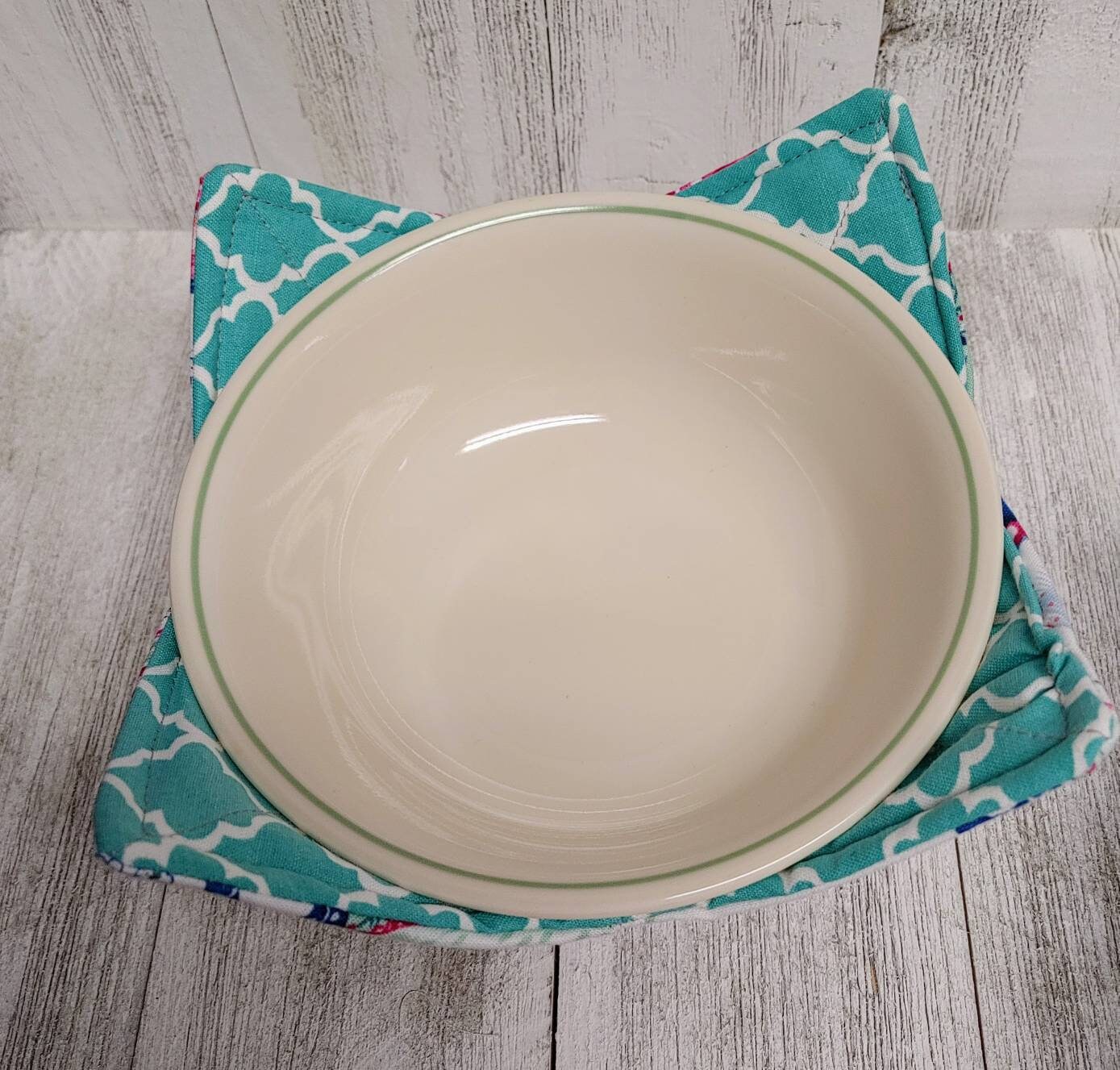 Quilted Fabric microwave bowl Cosys for use in the microwave, lined with 100% cotton fleece inside. Size Small fits 10 inch round or square bowls. No more fingers burned! Heat up your hot grits, oatmeal, soups, frozen dinner, etc. without burning your fingers. Use the handles for holding the fabric dish. Great for cold ice cream as well. Make great gifts for all accasions! Wedding showers, graduations, hostess gift, Valentines. Handmade by me in the USA. Buy as sets or many as you need for family and friends!