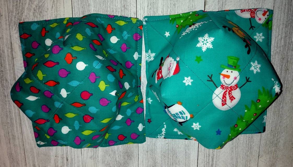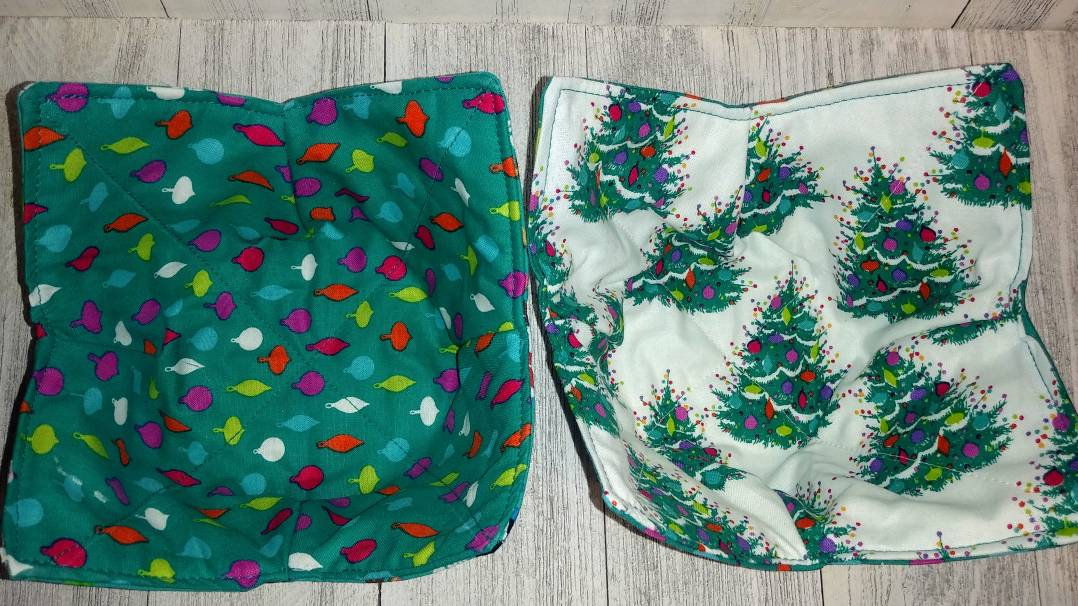 Quilted Fabric microwave bowl koozies for use in the microwave, lined with 100% cotton fleece inside. Size Small fits 10 inch round or square bowls. No more fingers burned! Heat up your hot grits, oatmeal, soups, frozen dinner, etc. without burning your fingers. Use the handles for holding the fabric dish. Great for cold ice cream as well. Make great gifts for all accasions! Wedding showers, graduations, hostess gift, Handmade by me in the USA. Buy many sets for yourself, family and friends!