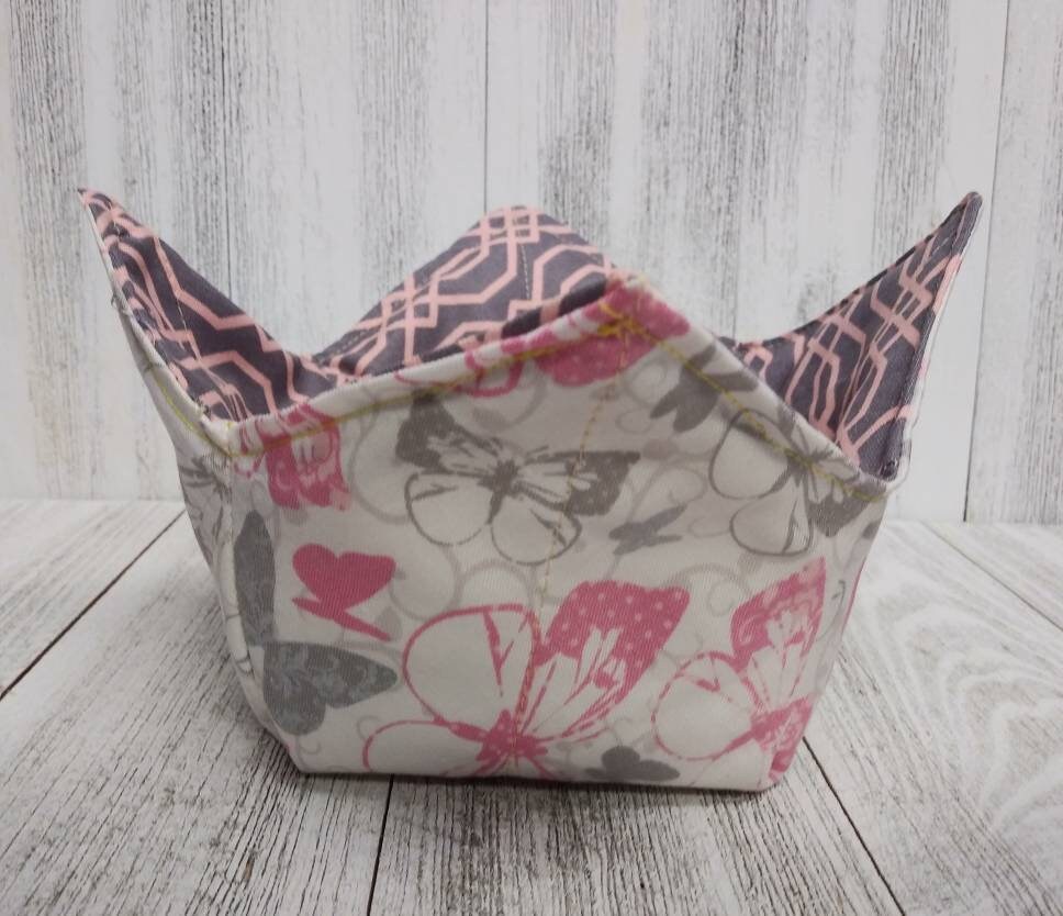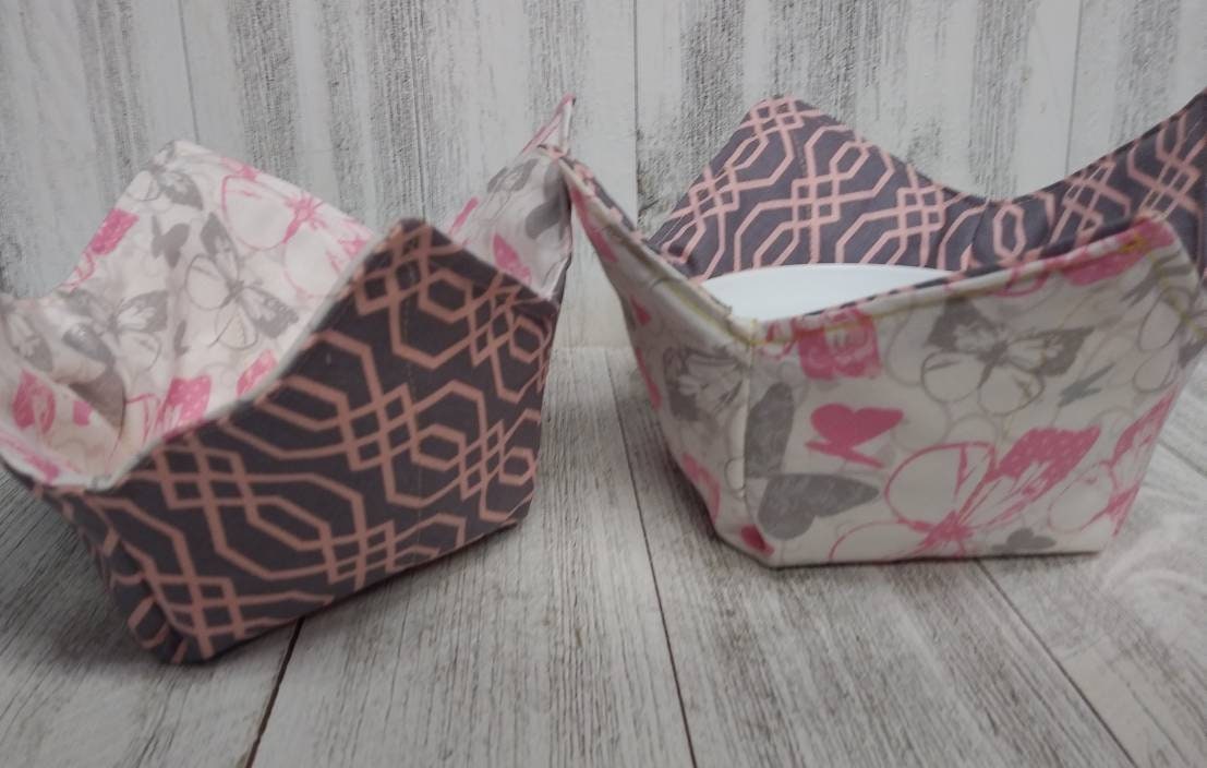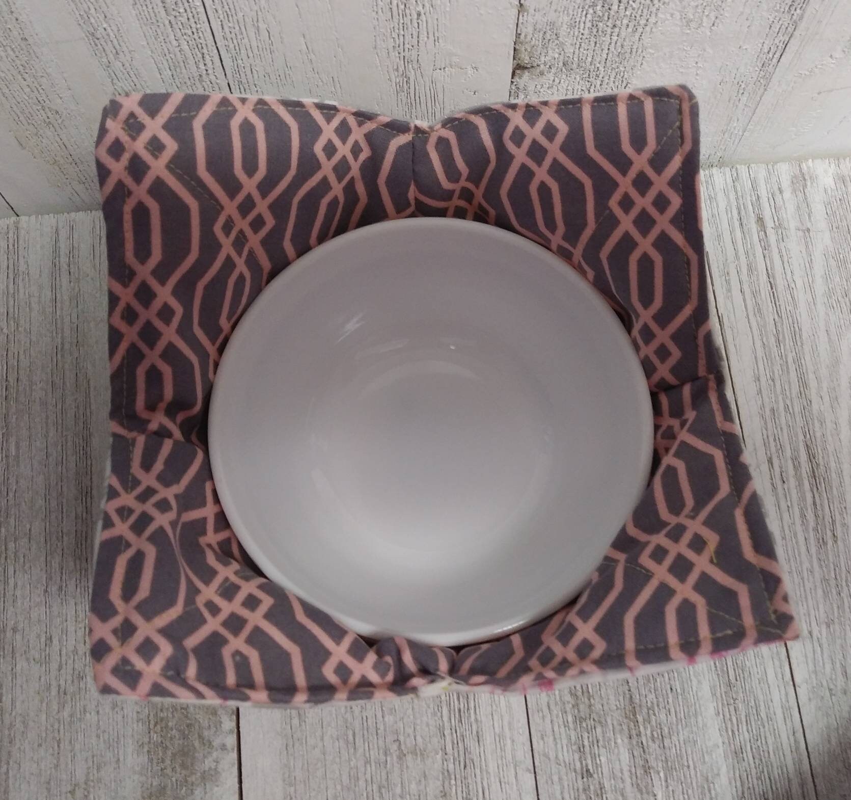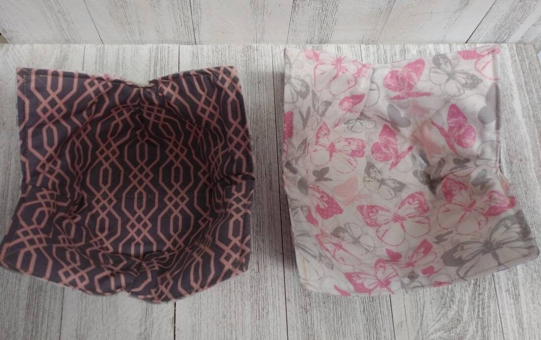 Quilted Fabric microwave bowl koozies for use in the microwave, lined with 100% cotton fleece inside. Size Small fits 10 inch round or square bowls. No more fingers burned! Heat up your hot grits, oatmeal, soups, frozen dinner, etc. without burning your fingers. Use the handles for holding the fabric dish. Great for cold ice cream as well. Make great gifts for all accasions! Wedding showers, graduations, hostess gift, Valentines. Handmade by me in the USA. Buy numerous sets for yourself, family and friends!