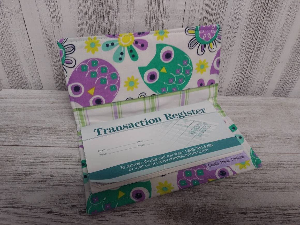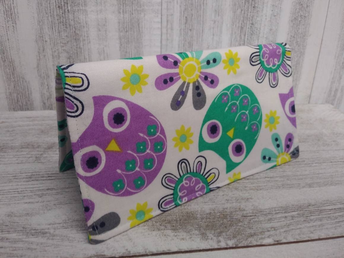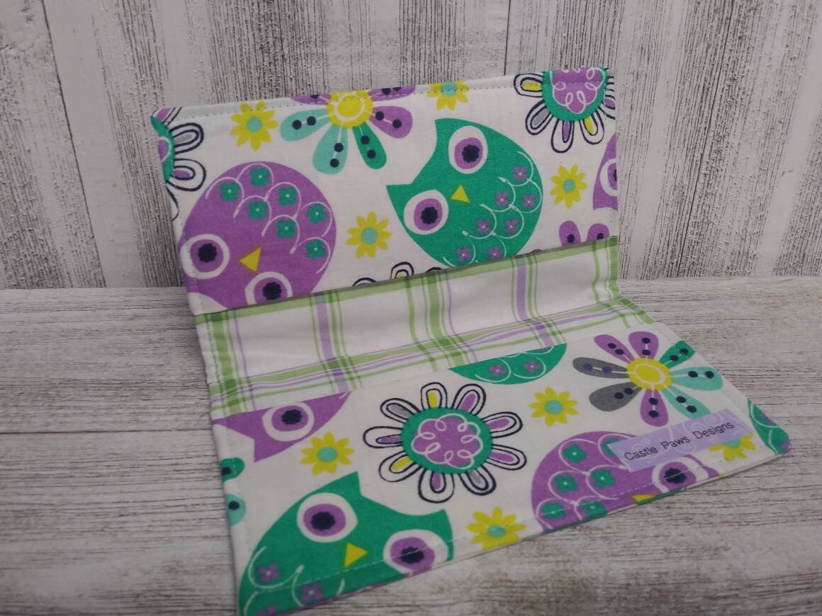 CHECK BOOK Cover OWLS Purple Green Document Registry Coupon Organizer Purse Purple Fabric